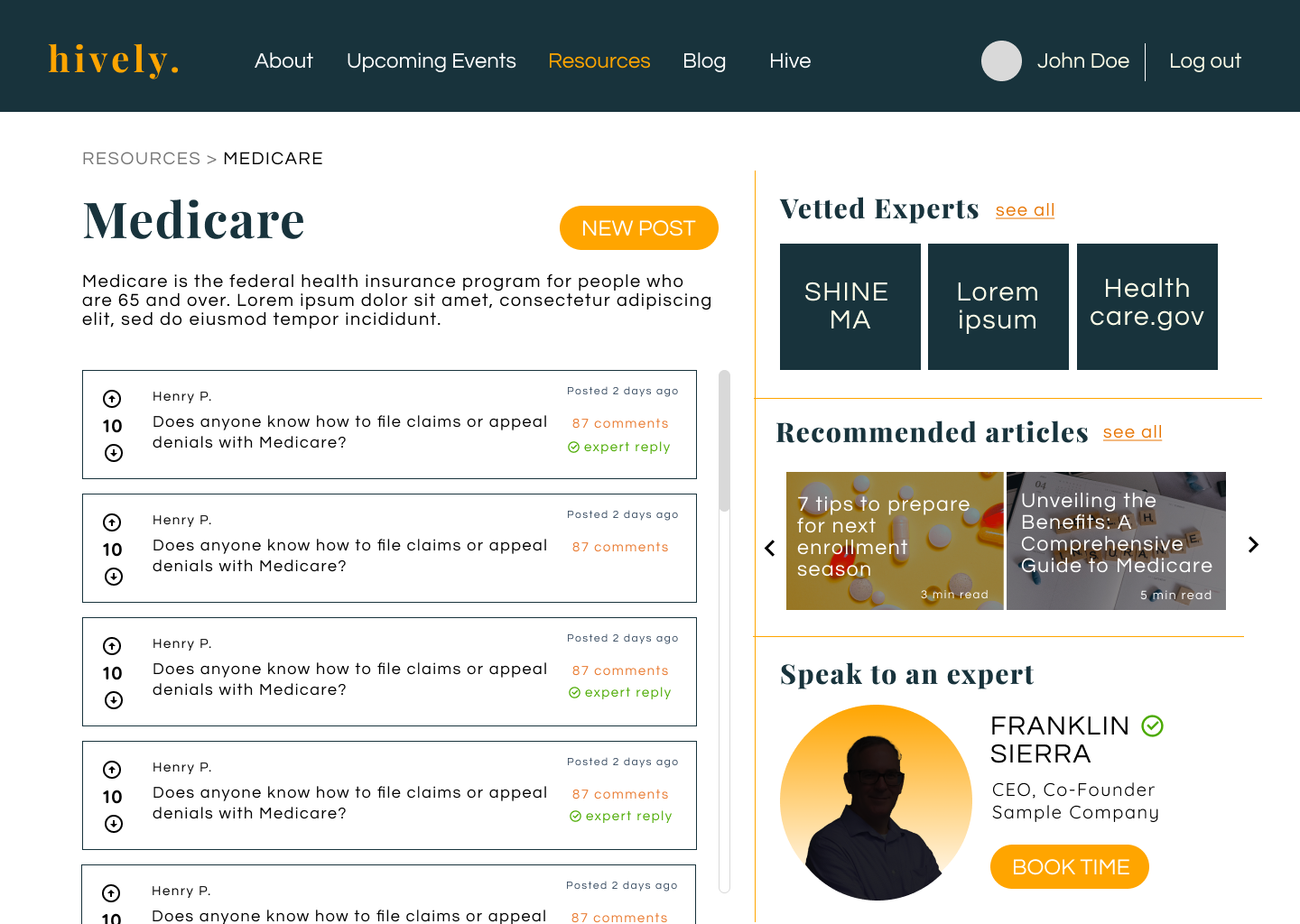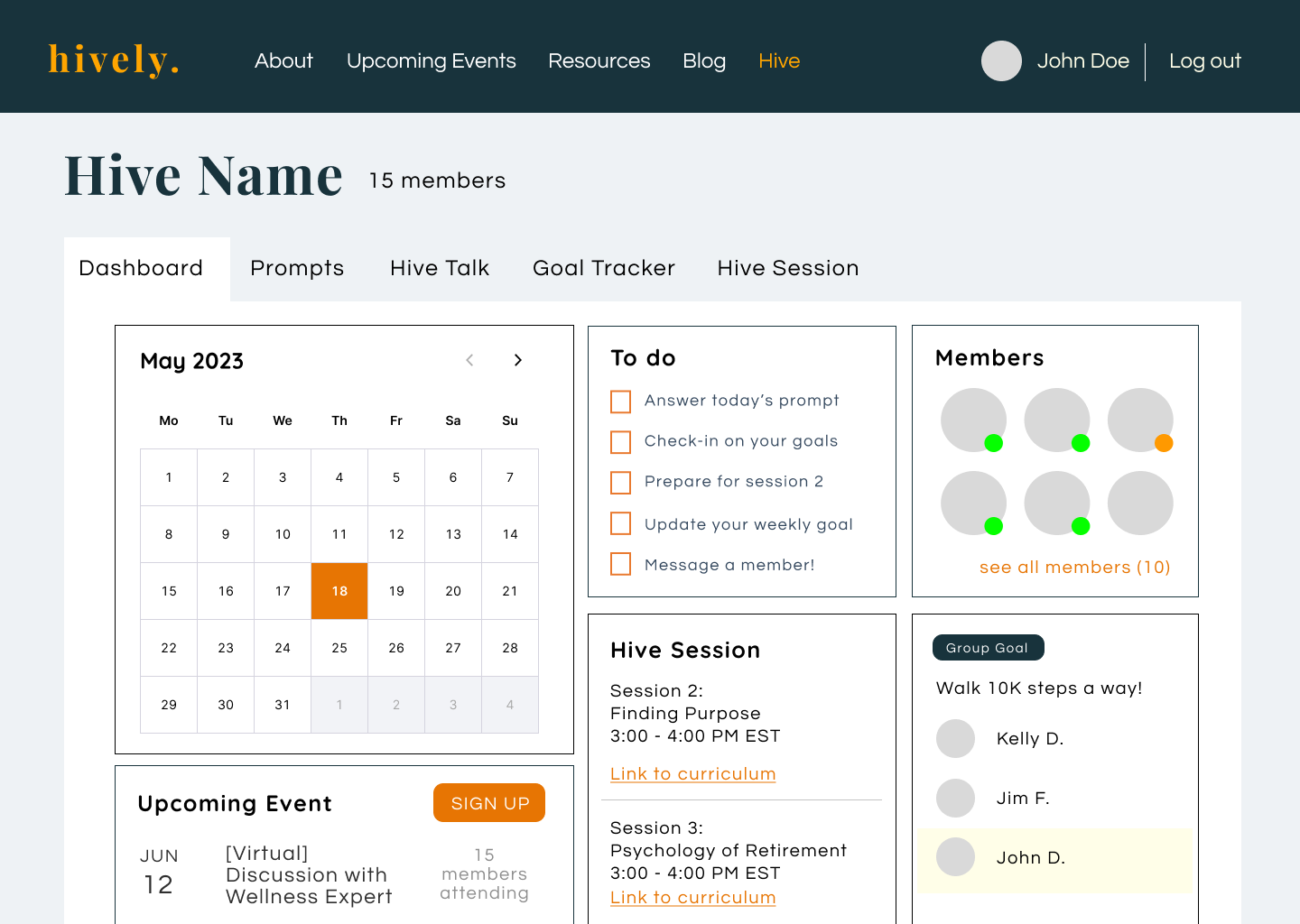 Hively is an end-end online destination for active older adults transitioning into retirement. Members can exchange peer ideas and support in discussion forums, find quality guidance in a marketplace of vetted experts, easily discover opportunities for work / volunteering / new hobbies, and even receive recommendations on a personalized diagnostic tool powered by AI, all anchored on the foundation of a strong peer community of others navigating a similar life transition.